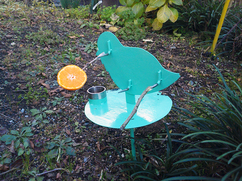 木の枝にミカンを刺して、出来上がり